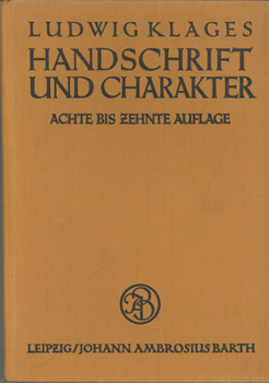 Klages, Ludwig: Handschrift und Charakter. Gemeinverständlicher Abriss der graphologischen Technik. J. A. Barth Verlag, Leipzig 1926. Gr.-8°. Achte bis zehnte Auflage. Mit 137 Figuren und 21 Tabellen. XII, 258 S., 1 Bl. OLwd.
