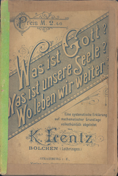 Lentz, K.: Was ist Gott? Was ist unsere Seele? Wo leben wir weiter? Eine systematische Erklärung auf mathemathischer Grundlage volksthümlich abgeleitet. Verlag von Fritz Schlesier, Strassburg i. E. 1896. 162 S., 1 Bl. (Inhalt) OKarton.