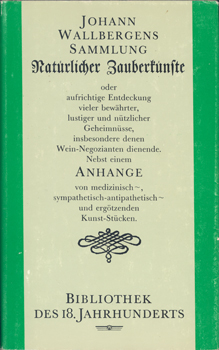 Wallbergen, Johann: Johann Wallbergens Sammlung Natürlicher Zauberkünste oder aufrichtige Entdeckung vieler bewährter, lustiger und nützlicher Geheimnüsse, insbesondere denen Wein-Negozianten dienende. Nebst einem ANHANGE von medizinisch-sympathetisch-antipathetisch und ergötzenden Kunst-Stücken. Gustav Kiepenheuer Verlag, Leipzig und Weimar 1988. Herausgegeben, mit einem Essay und einem Register von Christoph Hein. Anmerkungen von Birgit Dietzsch. Zeittafel von Rainer Schmitz. 461 S., 1 Bl. (Inhalt) goldgepr. OLwd. m. OUmschlag.