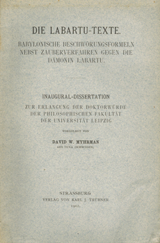 Myhrman, David W: Die Labartu-Texte. Babylonische Beschwörungsformeln nebst Zauberverfahren gegen die Dämonin Labartu. Verlag von Karl J. Trübner, Strassburg 1902. 1 Bl., 60 S., 1 Bl. OBroschur.