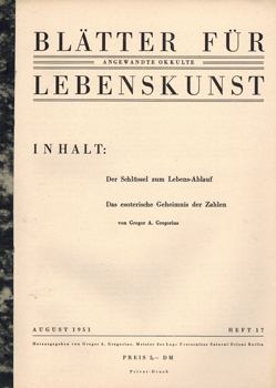 Blätter für angewandte okkulte Lebenskunst. August 1951 – [Heft 17]. Herausgegeben (als Privatdruck) von Gregor A. Gregorius. Meister der Loge Fraternitas Saturni Orient Berlin, Berlin 1951. 4°. 1 Bl. (Deckblatt m. Titel), 15 S. Typoskriptdruck mit Klammerheftung und Fälzelstreifen.