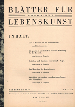 Blätter für angewandte okkulte Lebenskunst. September 1957 – [Heft 90]. Herausgegeben (als Privatdruck) von Gregor A. Gregorius. Meister der Loge Fraternitas Saturni Orient Berlin, Berlin 1957. 4°. 1 Bl. (Deckblatt m. Titel), 19 S. Typoskriptdruck mit Klammerheftung und Fälzelstreifen.