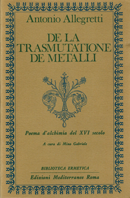 Allegretti, Antonio: De la trasmutatione de metalli. Poema d’alchimia del XVI secolo. Edizioni Mediterranee, Roma 1981. A cura die Mino Gabriele. 94 S., 1 Bl. Vlgs.-Anz. illustr. OKarton.